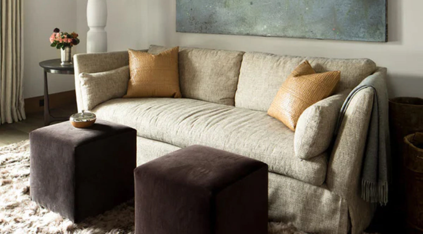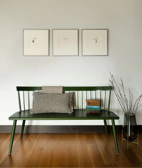 A historic log cabin, reimagined for a preservation-minded couple. The interior feels simultaneously seamless and sophisticated, open and intimate. The Moran Swivel, seen here, anchors the space. Nesting trays provide a home for books, coasters, or whatever needs wrangling in a lived in space. Wool-linen blankets and pillows add layers of texture throughout.